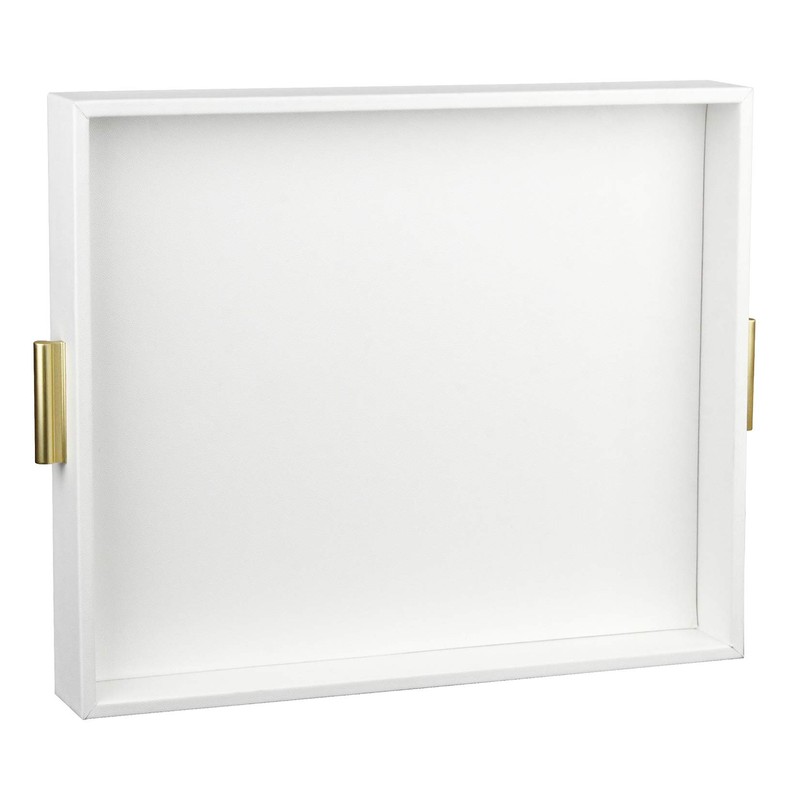 HofferRuffer Extra Large Serving Tray with Handles, Elegant Faux Leather Storage Decorative Tray for Coffee Table, Ottoman, Console Table (White Tray+Golden Handle)