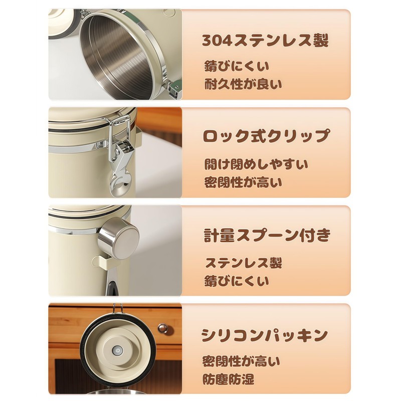 Stainless Steel: This coffee bean storage container is made of high quality 304 stainless steel. It is sturdy and will not break, and will not deform even if exposed to external impacts, and it is resistant to rust and can be placed in a humid environment. It is highly durable and can be used repeatedly.