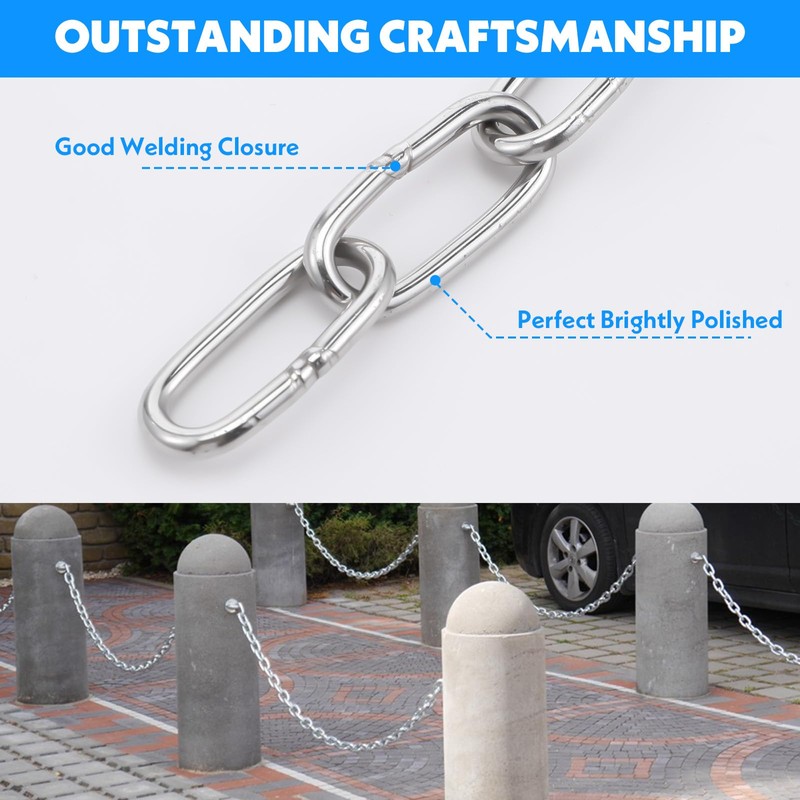 • Heavy-Duty Performance: Our stainless steel chain supports up to 176 lbs, ideal as a chain for hanging lights, chandeliers, or planters. The burr-free welded links won't snag fabrics or scratch surfaces, ensuring smooth operation as a long chain solution.