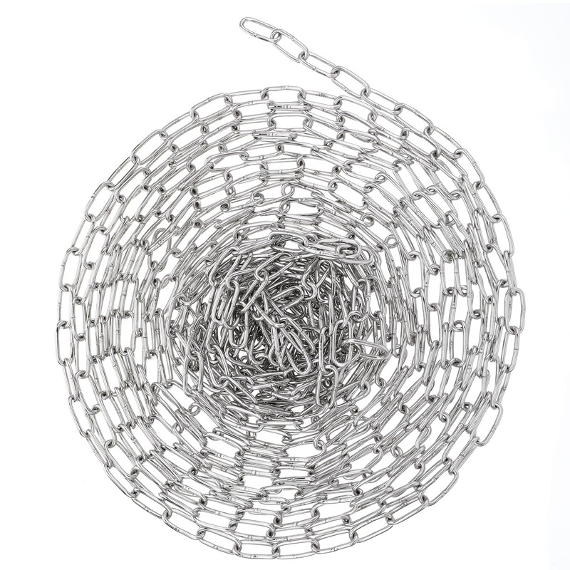 This 39.4 ft stainless steel chain features 3 mm thick links (1.18" x 0.51") as a durable chain for hanging lights, plants, or decor. The 201-grade metal chain for hanging resists rust, supporting 176 lbs. Use this decorative chain indoors/outdoors for chandeliers, swings, or displays.