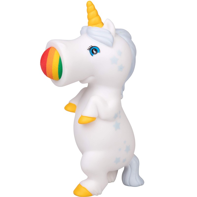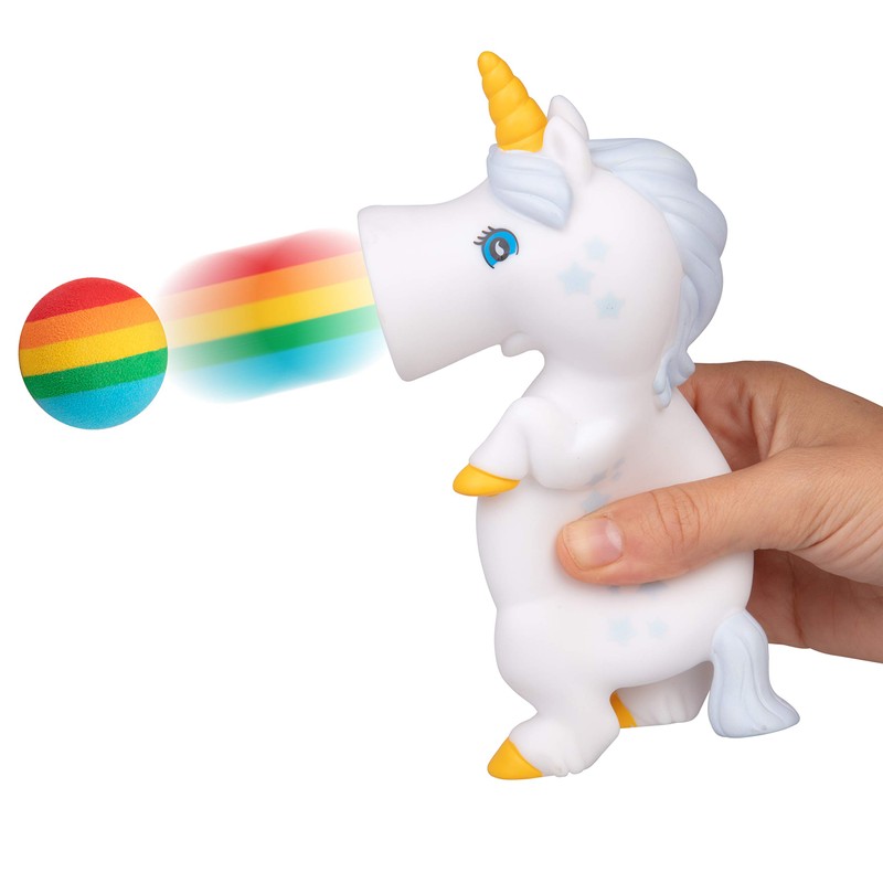 - Ready, aim, POP! Squeeze the White Unicorn Popper to shoot a soft foam ball up to 20 feet!