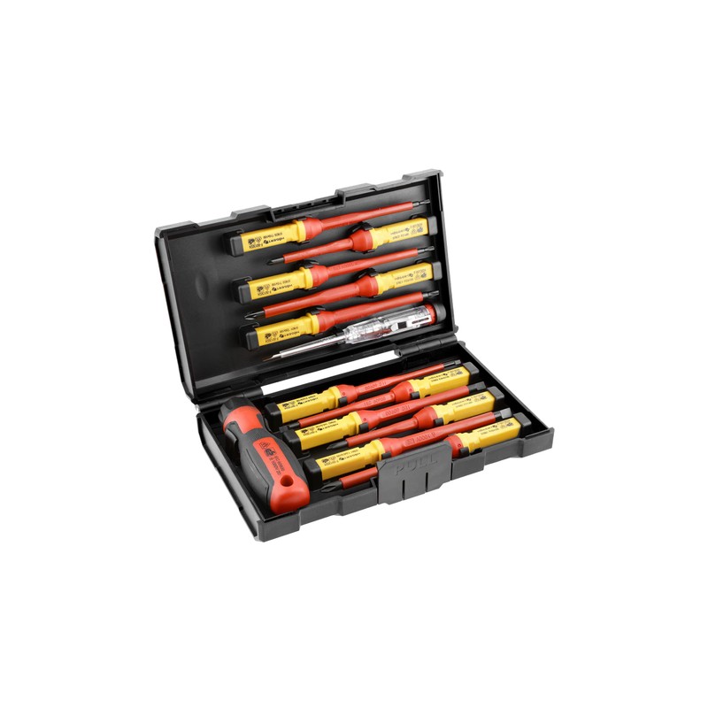 - This set therefore offers a variety of screwdrivers and a voltage tester that meet the requirements of the standards and are suitable for electrical work.