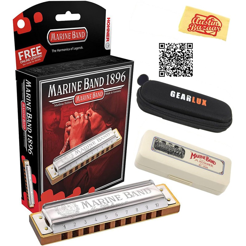 Hohner Marine Band 1896 Harmonica - Key of A Bundle with Case, Pouch, Austin Bazaar Online Manual, and Polishing Cloth