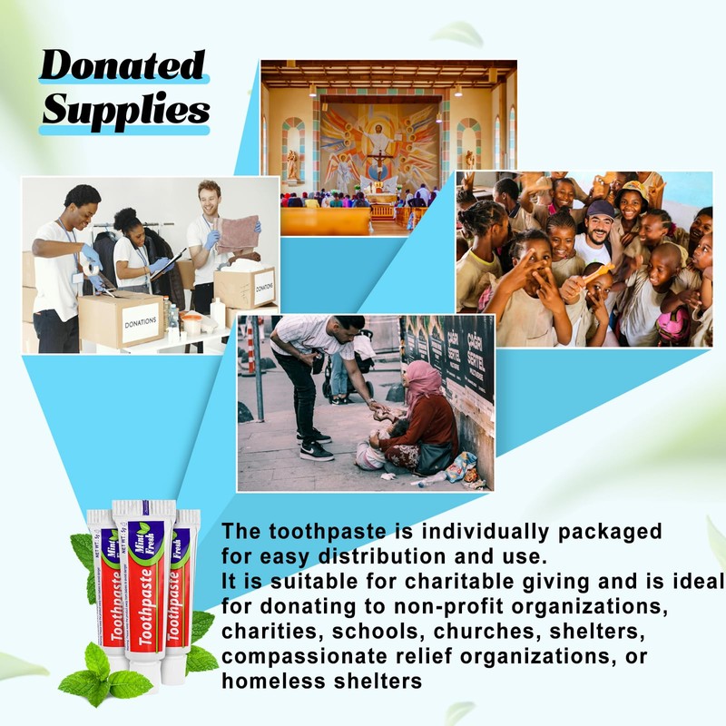 - Easy to Donate:The toothpaste is individually wrapped, making it easy to dispense and use.So it's perfect for charitable donations.Mini toothpaste is ideal for donating to non-profit organizations, charities, schools, churches, shelters, compassion relief organizations or homeless shelters