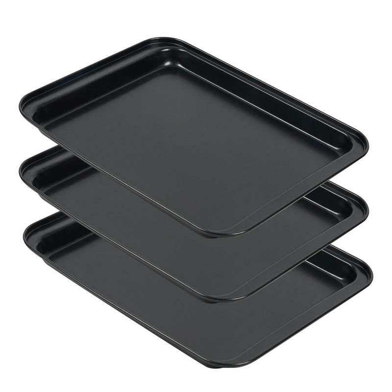 - ?Cookie Sheets Set of 3 ? These Small baking sheets (Outside SIZE: 9.5inch X 7.1inch X 0.8inch, Actual use inside SIZE:7.5inch X 6inch X 0.5inch) are crafted from high-quality food-safe carbon steel which provides durability & fast even heat distribution for uniform browning oven-safe up to 445°F. These baking pans won't warp or bend out of shape.
