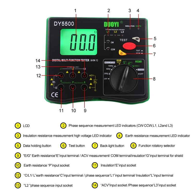 HOJILA DY5500 4 in1 Multimeter Earth Ground Resistance Tester Meter Insulation Tester Voltmeter Phase Indicator