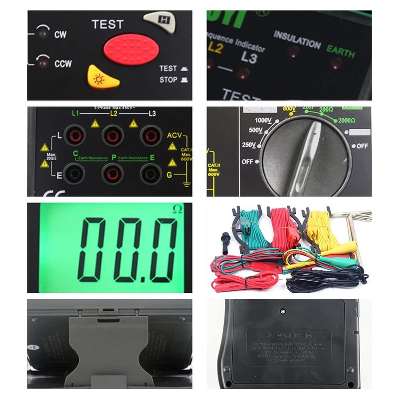 - Three test voltage 2500V/1000V/500V measure insulation resistance to 20G ohms