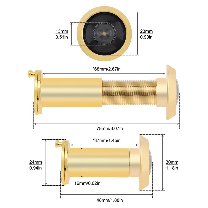- Easy Installation--The door viewers are suitable for doors with a thickness of 1-1/2" to 2-3/8". Simply drill a suitably positioned 0.63 inch diameter hole, insert the viewer into the hole then screw the two sides together and tighten by hand.After installed it, you could see a lot of the area.