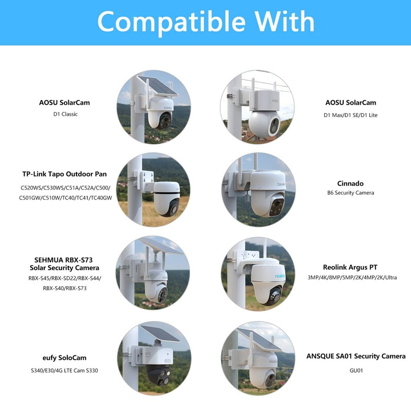 - Compatible Device: AOSU SolarCam D1 SE/Lite/Max; ANSQUE Security Cameras Wireless Outdoor (GU01/SA01); SEHMUA RBX-S73/RBX-S45/RBX-S44/RBX-S40/RBX-SD22 Solar Security Cameras Wireless Outdoor.
