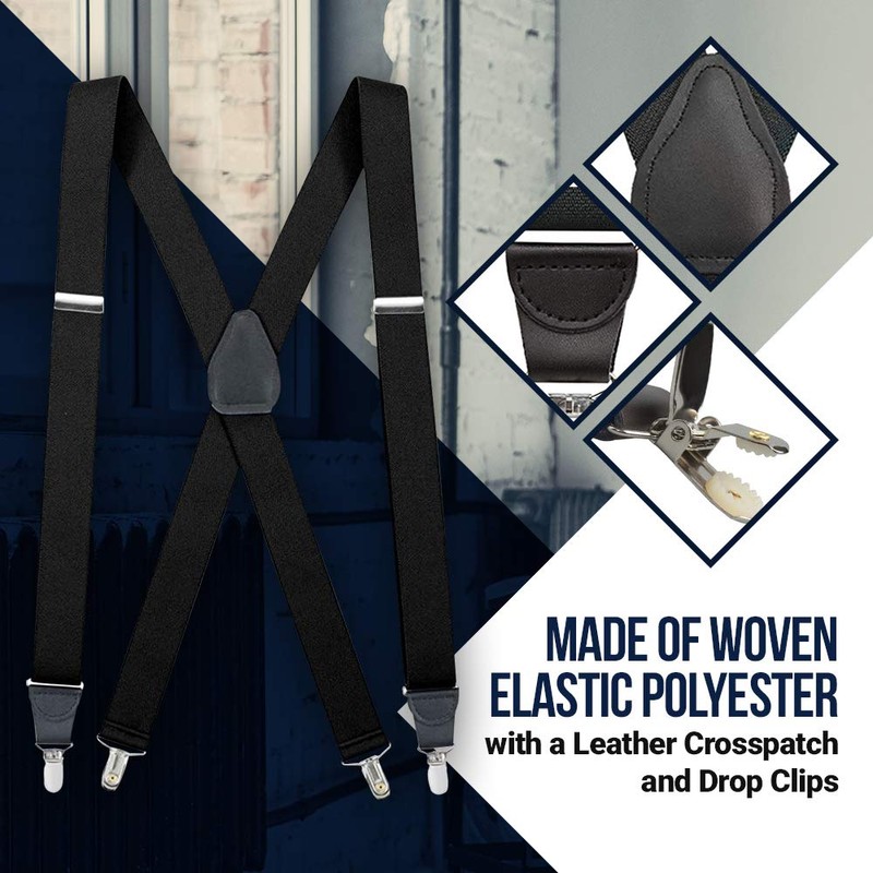 - HIGH-QUALITY CONSTRUCTION: Measuring 1.25 inches wide, these suspenders are expertly crafted of 100% woven elastic polyester with a genuine leather crosspatch and drop clips to provide the perfect blend of comfort and durability.