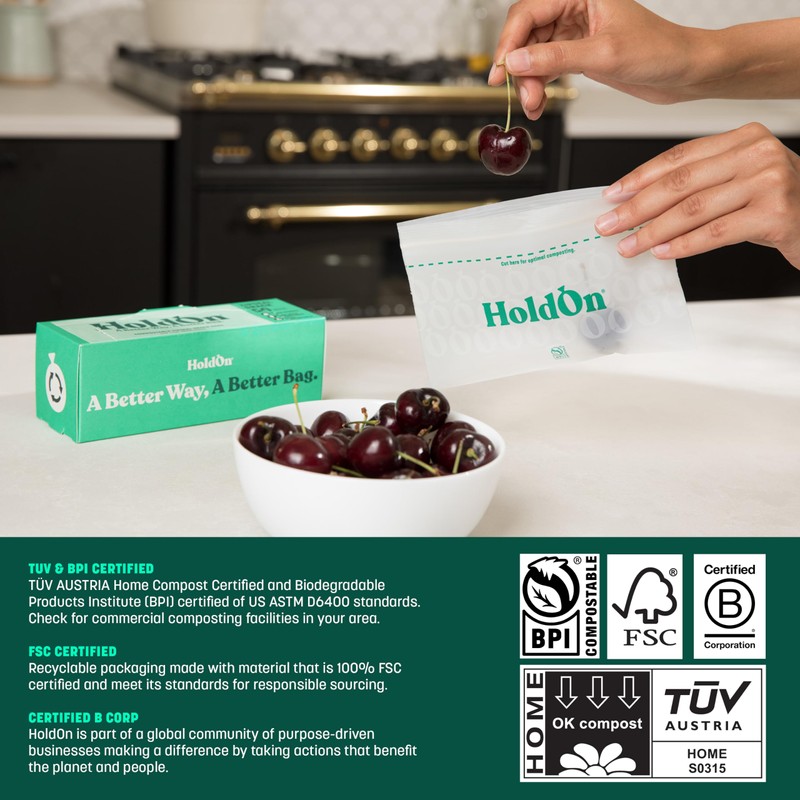 - Carry With Confidence: Our HoldOn compostable bags feature a secure, kid-friendly zip seal to prevent leaks and spills to keep the food fresher longer. These compostable snack bags allow you to stash and store without any traditional plastic waste guilt.