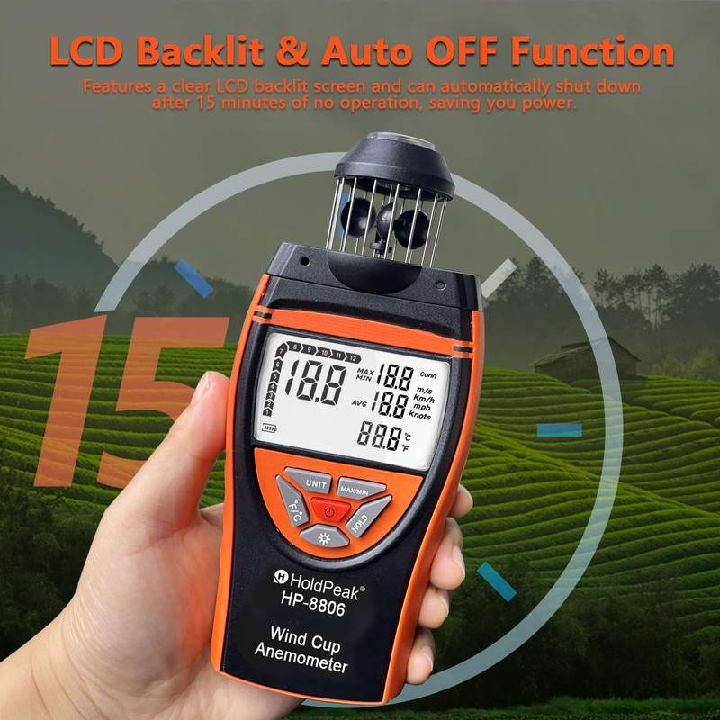 HoldPeak 8806 Digital Wind Speed Meter Meter 4 Cups Wind Speed 0.7~42m/s Wind Speed and Temperature (℃/℉) with Compass for Shooting, Fishing, Sailing