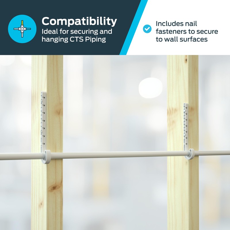 - EASY TO INSTALL: Plastic pipe hanger features numerous nail holes allow you to get the proper length during installation; can be installed flush against a wall or stud or used overhead