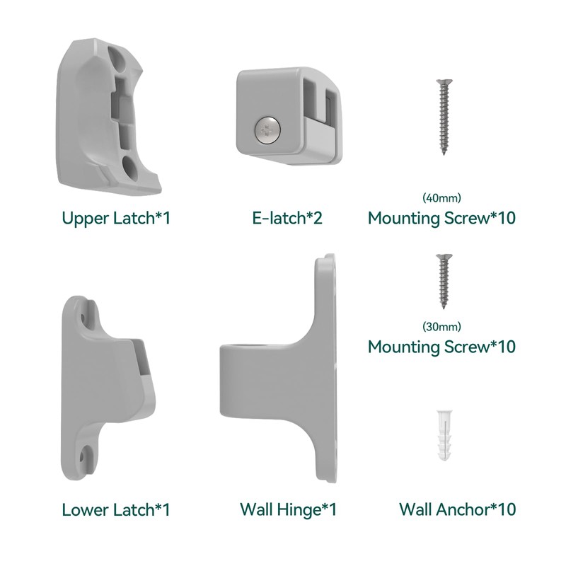 • What You Will Get - Includes 1* upper latch, 1* lower latch, 2* E-latch, 1* wall hinge and some screws and wall anchors (gate not included). If you have any questions, please feel free to contact us.