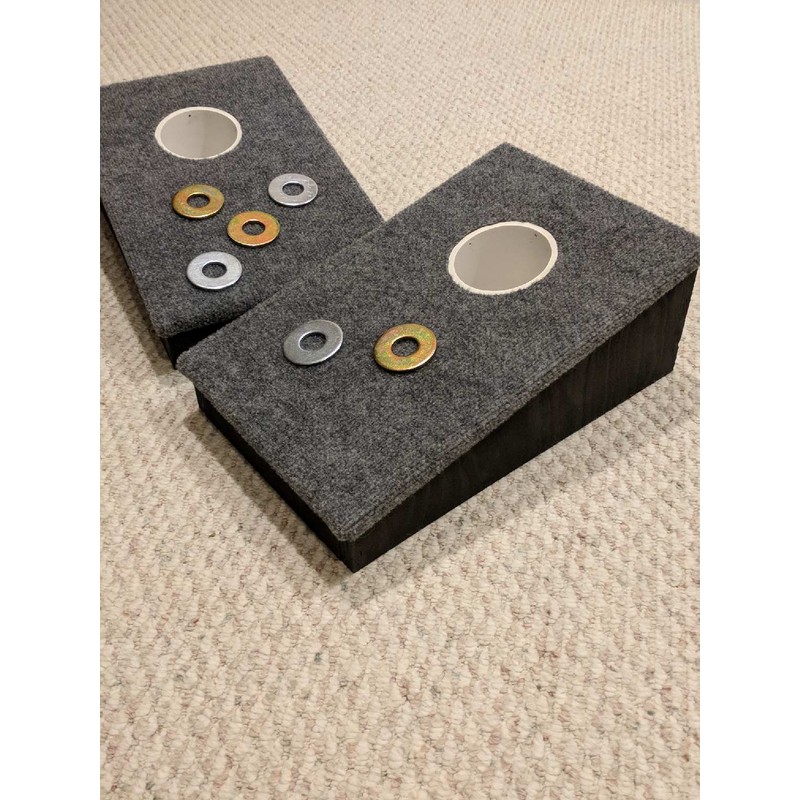 Our 1 Hole Slant board set measures 12"x18" and has a 4 inch incline. 4" tubes, it comes with six 2 1/2" inch washers. Standard rules call for the Game boards to be spaced 20 feet apart. It also includes instructions for play. I specialize in Washer Games. Hand made with quality, durability and affordability being most important. I make the real games, made to commonly accepted regulation dimensions, and constructed right!! No shortcuts. Our Washer Games are perfect for family get-togethers, barbecues, picnics, camping trips, tailgate parties at football, baseball and auto racing events. They also make wonderful gifts for all ages and occasions. Increasing or reducing the distance between the boxes controls the level of challenge. Silver zinc and yellow zinc coated washers... nothing to chip or repaint ever!!