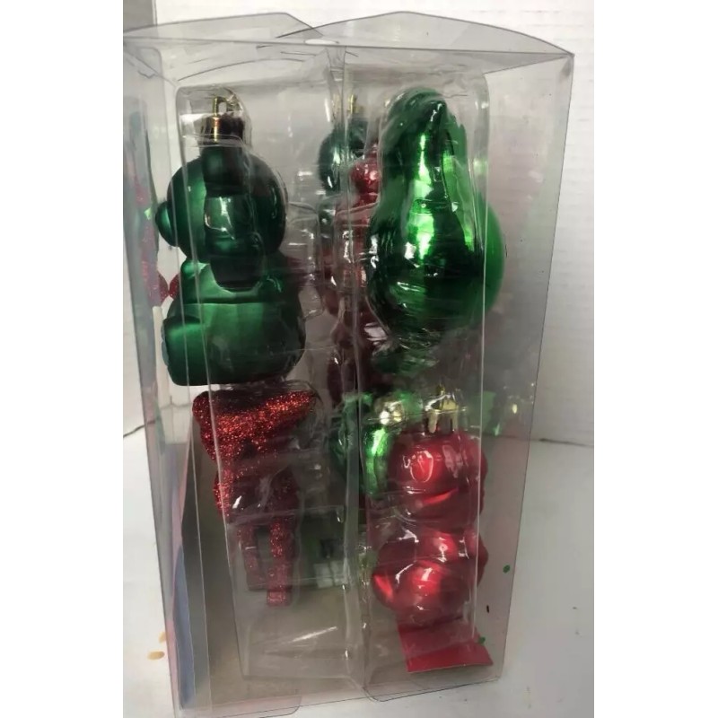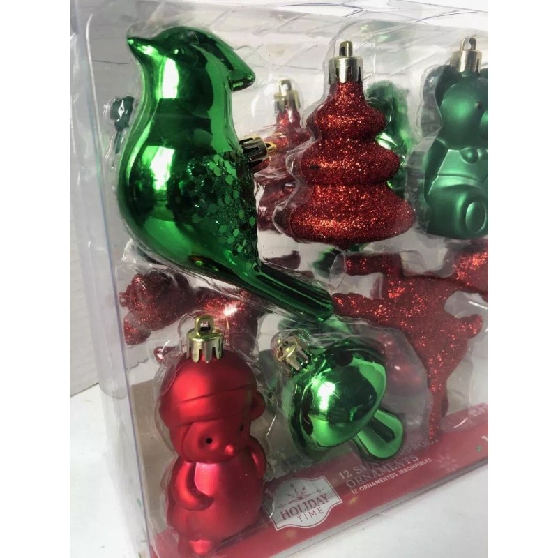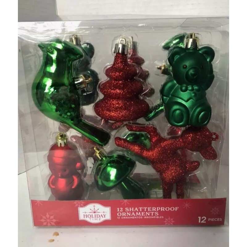 Holiday Time 12 Shatterproof Ornaments Bird, Teddy, Reindeer, Tree W/Glitter