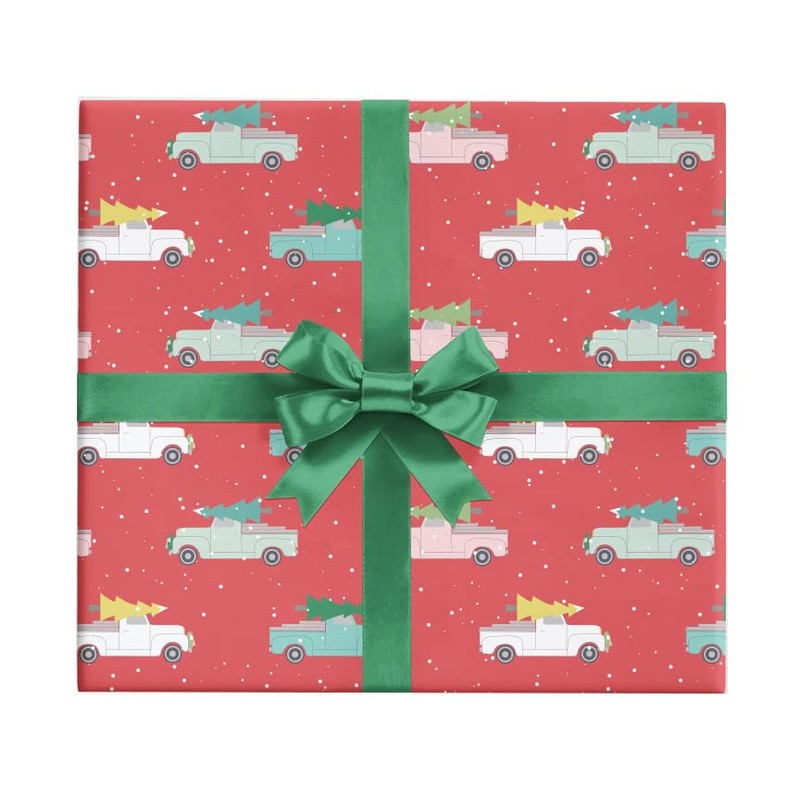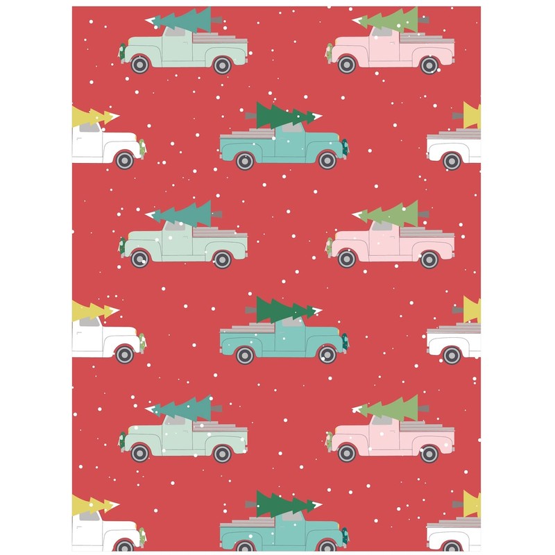 Holiday Trucks Christmas Giftwrap Paper - Six Flat Folded Sheets 19.5x27 Inches, Masculine Christmas Wrapping Paper with Vintage Trucks on a Red Background