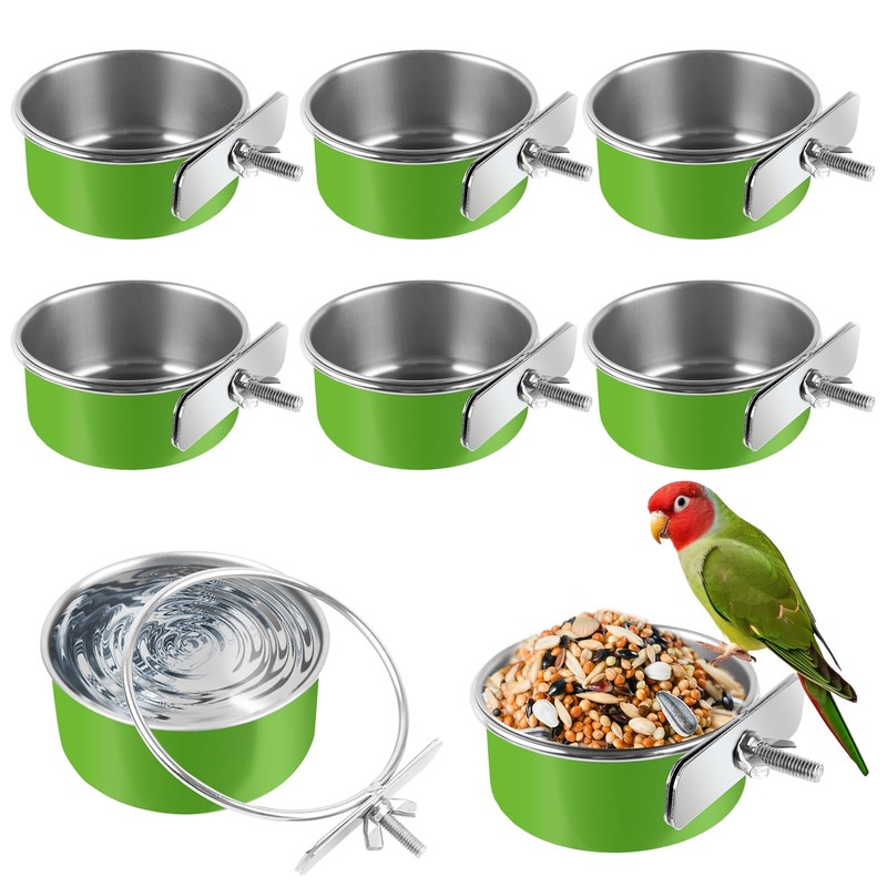 - 【Contents】The package includes 8 sets of hanging pet bowls and 8 clamp holders. The stainless steel bird cups measure 3.9 x 1.8 inches with a capacity of 10 ounces. These green cage bowls meet your pets' dietary needs and are great cage accessory components, making the cage more ornamental and blending better into home decor.