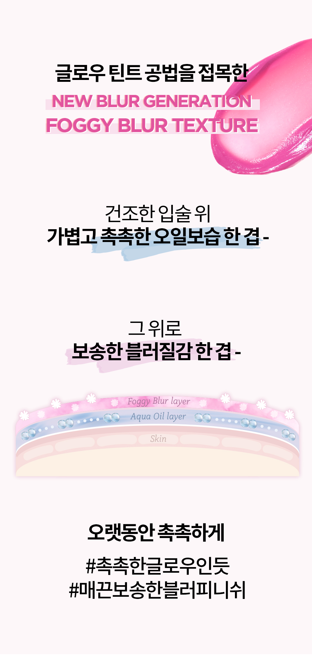 The Like Shell collection contains brilliant sparkle and pure white mood. Moisturizing and cozy foggy blur tint. Light and comfortable foggy blur texture on lips. Soft tinting with 30% translucent color. Provides light and moisturizing oil layer and another soft blur on lips. Provides long-lasting moisturizing glow with smooth and soft blur finish.