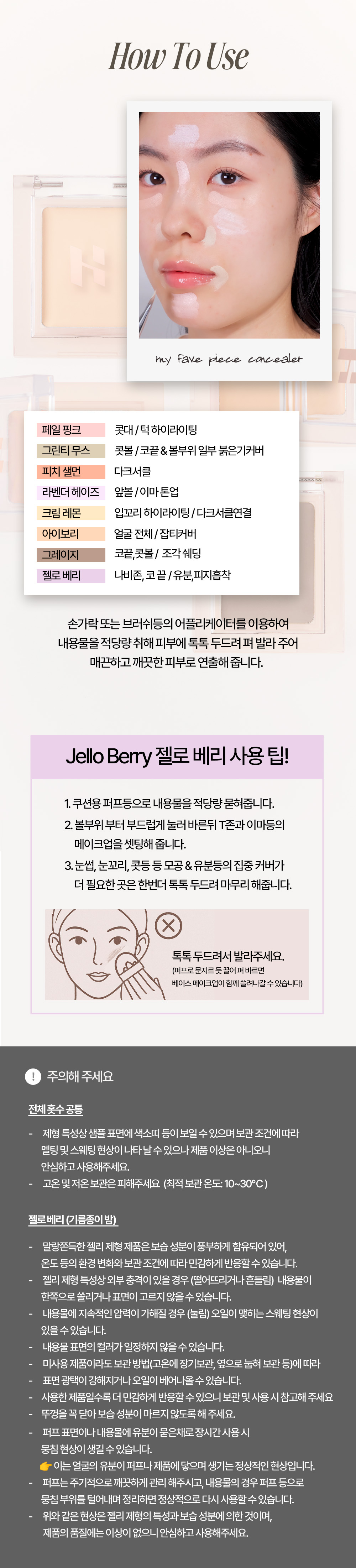 Pale Pink: Nose/chin highlighter Green Tea Mousse: Redness coverage on nose and cheeks Peach Salmon: Dark circle coverage Lavendar Haze: Cheek/forehead tone up Cream Lemon: Highlighter on corner of mouth, dark circle coverage Ivory: Blemish coverage on entire face Greige: Contouring on tip of nose and nose area Jello Berry: Sebum control on the butterfly zone and tip of nose