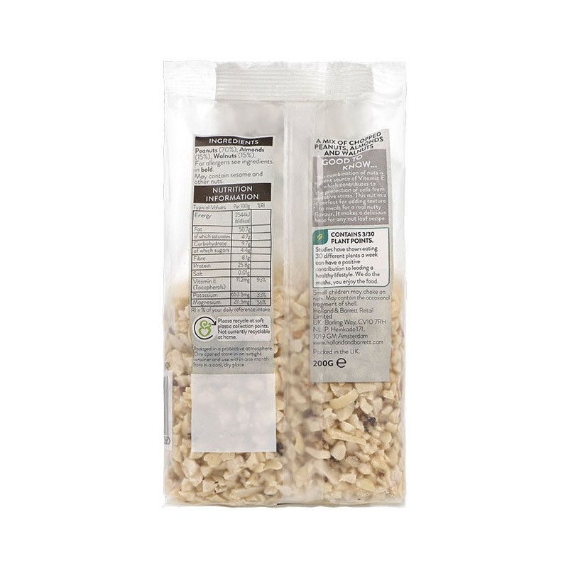 Holland & Barrett Chopped Mixed Nuts contains chopped peanuts, almonds and walnuts, great for baking up tasty treats with.