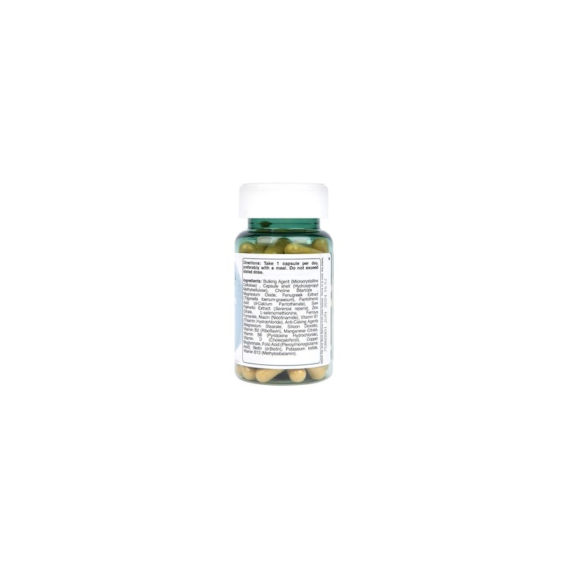 Bulking Agent (Microcrystalline Cellulose), Capsule shell (Hydroxypropyl Methylcellulose), Choline Bitartrate, Magnesium Oxide, Fenugreek Extract (Trigonella foenum-graecum), Pantothenic Acid (d-Calcium Pantothenate), Saw Palmetto Extract (Serenoa repens), Zinc Citrate, L-selenomethionine, Ferrous Fumarate, Niacin (Nicotinamide), Anti-Caking Agent (Magnesium Stearate, Silicon Dioxide), Vitamin B1 (Thiamin Hydrochloride), Vitamin B2 (Riboflavin), Manganese Citrate, Vitamin B6 (Pyridoxine Hydrochloride), Vitamin D (Cholecalciferol), Copper Bisglycinate, Folic Acid (Pteroylmonoglutamic Acid), Biotin (d-Biotin), Potassium Iodide, Vitamin B12 (Methylcobalamin).