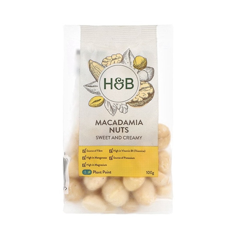 Holland & Barrett Macadamia Nuts contain essential nutrients such as dietary fibre and antioxidant manganese. These sweet and creamy nuts are ideal for snacking and baking.