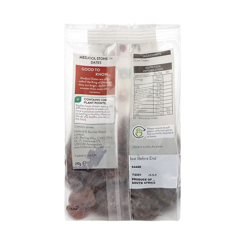 Holland & Barrett Medjool Dates are soft and succulent. Medjool dates offer a high in fibre, potassium and a source of iron.