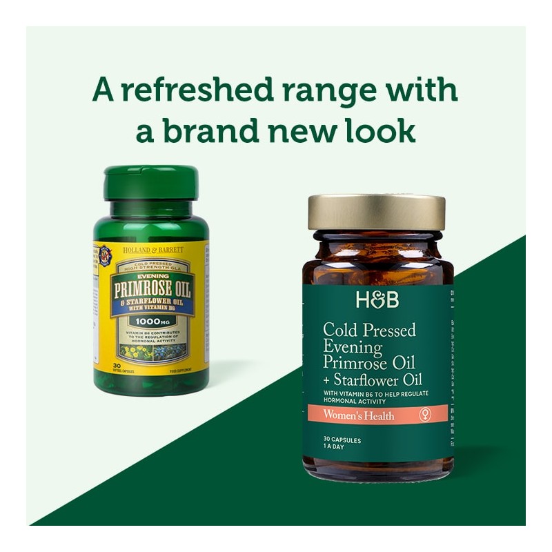 Holland & Barrett Evening Primrose Oil and Starflower Oil Supplement has been made to nourish your body with two fatty acids that it can’t make by itself: Linolenic Acid (LA) and Gamma Linolenic Acid (GLA). These Evening Primrose Oil Supplements also contain vitamin B6, which contributes to the regulation of normal hormonal activity. Within the body Linoleic Acid is metabolised to GLA, which is essential for the production of certain hormone-like substances called prostaglandins. Not all fatty acids can be made in the body and therefore must be supplied through diet or supplementation. Human breast milk is one of the richest natural sources of GLA, whilst LA can be found in safflower, hemp, and sunflower oils.