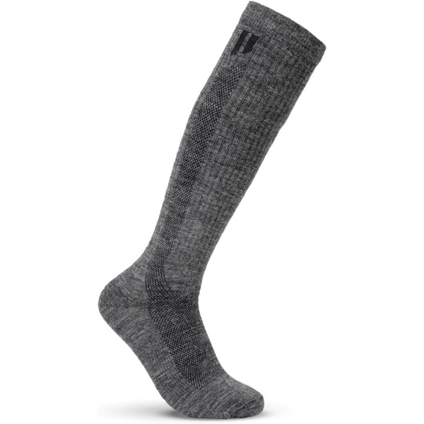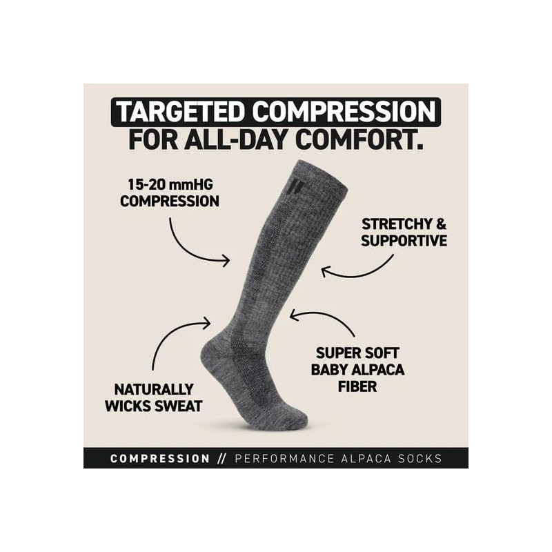 - WIDE COMPRESSION SOCKS: Our thickest alpaca socks ideal for cold weather, made to stand against the coldest temperatures. The perfect fit for facing the bitter cold, or warming up post-outdoor adventure. Made with 40% Premium Peruvian Baby Alpaca Fiber, 33% Stretch Nylon, 20% Polyester and 7% Spandex. Available in grey and black and a variety of sizes for men and women.