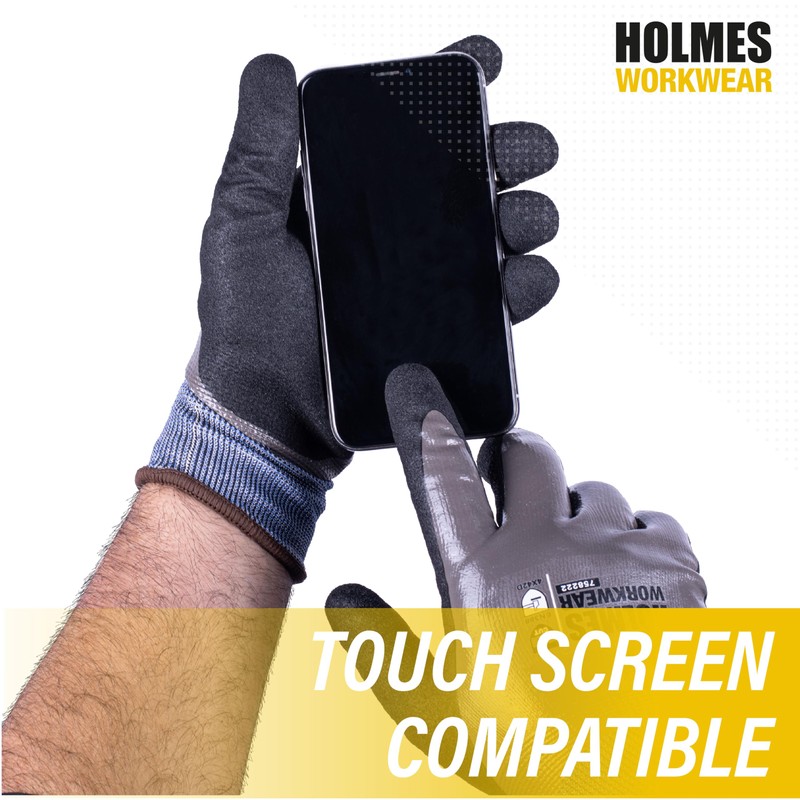 - TOUCH SCREEN COMPATIBILITY: Stay connected on the job! Holmes Workwear Double-Coated Sandy Nitrile gloves feature touchscreen compatibility, making it easy to use devices while wearing your work gloves; Never miss an important call or message again.
