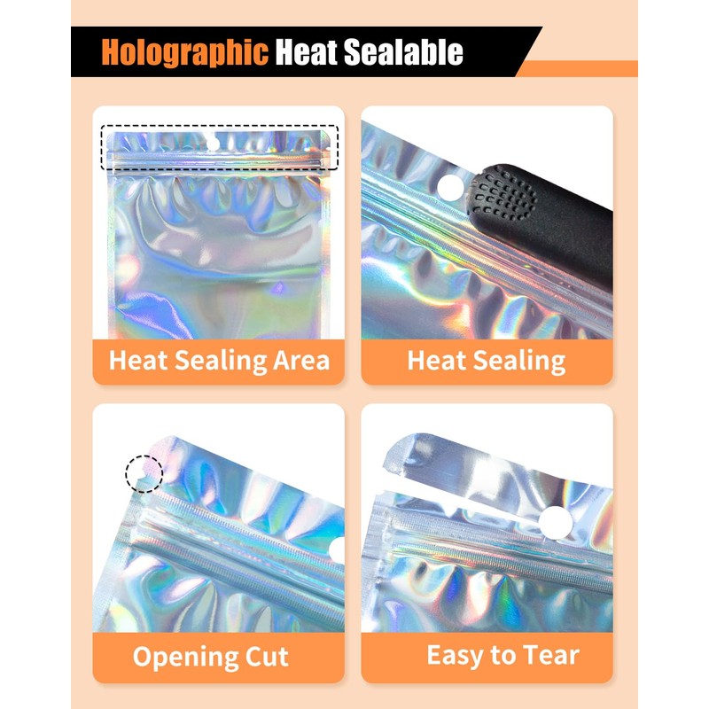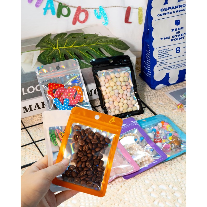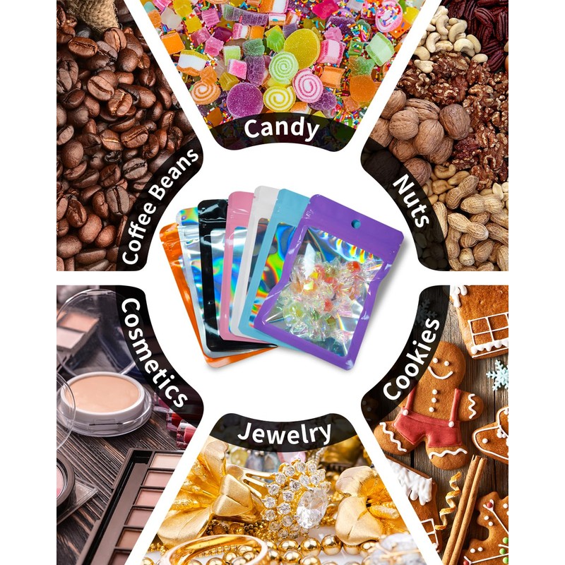 - 【Holographic and Eye-catching】These resealable candy bags have a holographic color on the surface, making it easier for you to quickly identify items. This packaging bag adopts a rounded corner design to prevent you from accidentally touching sharp corners and scratching your skin. The hanging hole design of the packaging bag can make it convenient for you to hang and display these bags, increasing their ornamental value.