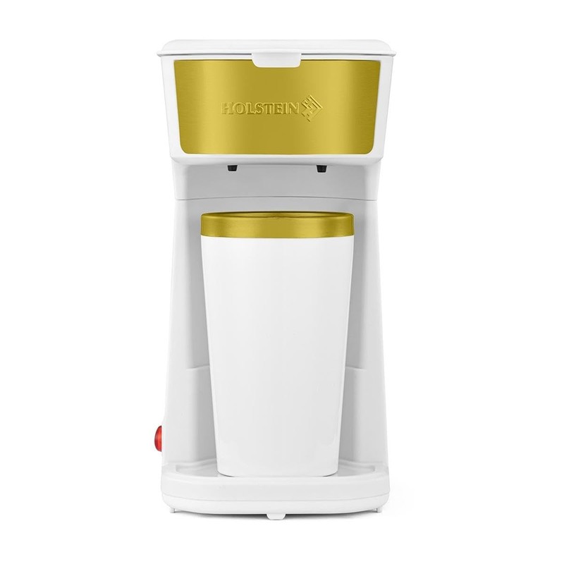 Holstein Housewares Single Serve Coffee Maker, 14oz Personal Coffee Brewer Machine with Reusable Filter, One Touch Operation & Auto Shut Off, White and Gold