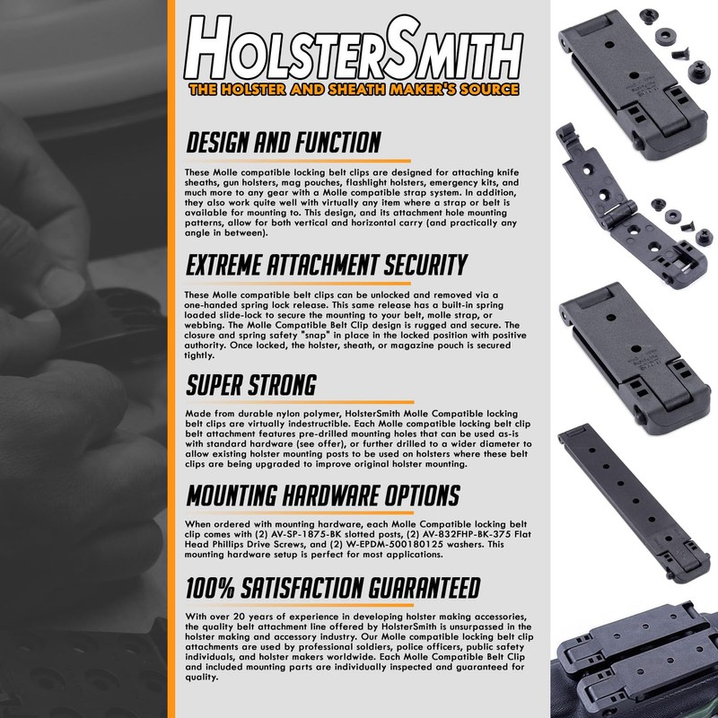 - 100% Satisfaction Guaranteed: With over 20 years of experience in developing holster making accessories, the quality belt attachment line offered by HolsterSmith is unsurpassed in the holster making and accessory industry. Our Molle compatible locking belt clip attachments are used by professional soldiers, police officers, public safety individuals, and holster makers worldwide. Each Molle Compatible Belt Clip and included mounting parts are individually inspected and guaranteed for quality.