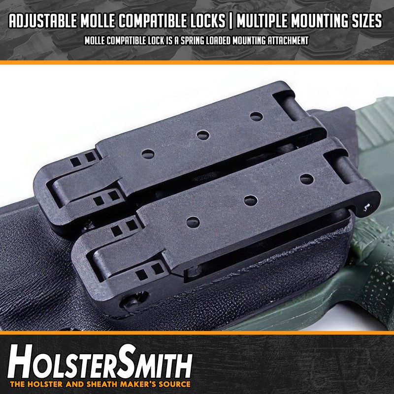 - Super strong: Made from durable nylon polymer, HolsterSmith Molle Compatible locking belt clips are virtually indestructible. Each Molle compatible locking belt clip belt attachment features pre-drilled mounting holes that can be used as-is with standard hardware (see offer), or further drilled to a wider diameter to allow existing holster mounting posts to be used on holsters where these belt clips are being upgraded to improve original holster mounting.
