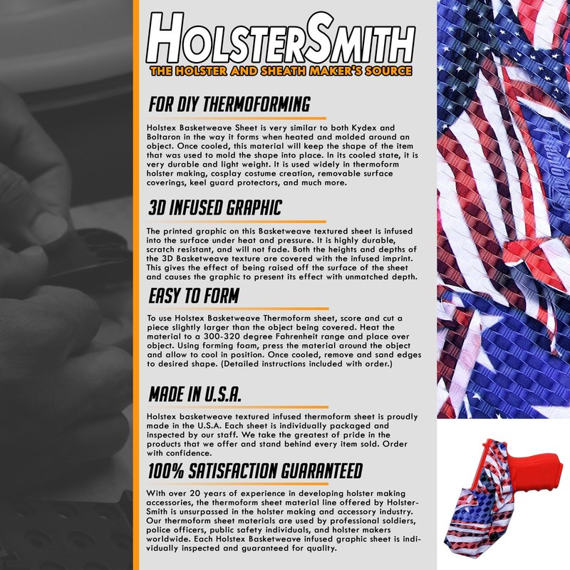 - 100% Satisfaction Guaranteed: With over 20 years of experience in developing holster making accessories, the thermoform sheet material line offered by HolsterSmith is unsurpassed in the holster making and accessory industry. Our thermoform sheet materials are used by professional soldiers, police officers, public safety individuals, and holster makers worldwide. Each Holstex Basketweave infused graphic sheet is individually inspected and guaranteed for quality.