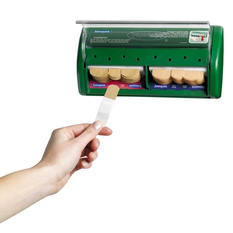 Der Pflasterspender Salvequick® von Holthaus Medical ist praktischer Spender mit Pflastereinsätzen, die bei der Entnahme gebrauchsfertig sind, da eine der beiden Schutzfolien direkt abgezogen wird.