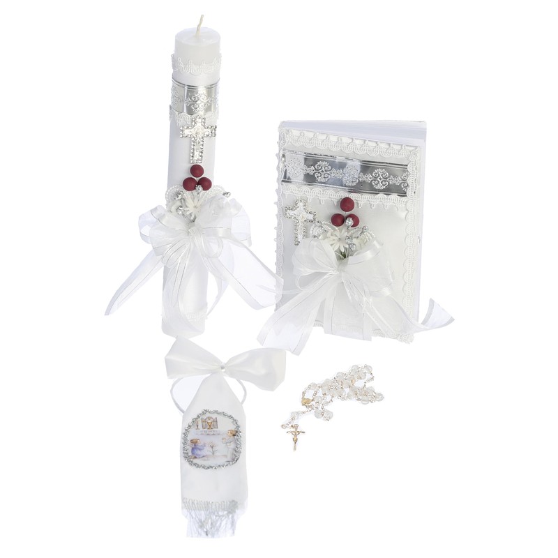- 4 PIECE SET: This holy communion candle set comes with a candle, a new testament SPANISH bible, rosary, and a communion armband for boys