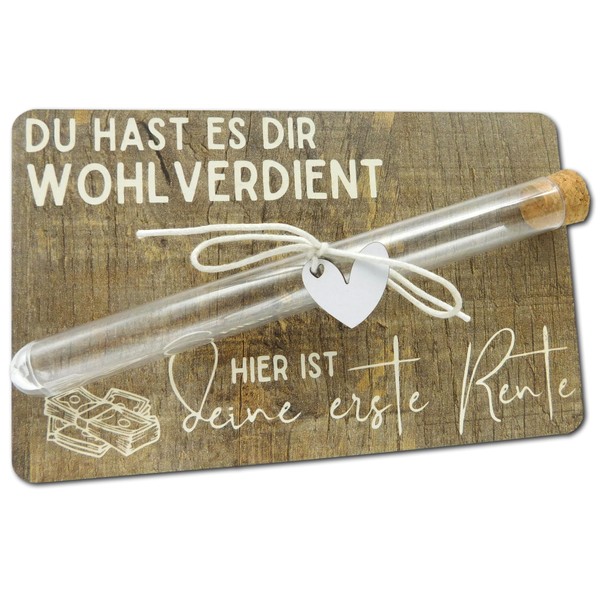 Holzkarte mit Gravur „Du hast es dir wohlverdient, hier ist deine erste Rente“ – Geldgeschenk zur Rente & Pensionierung – inkl. Reagenzglas für Geld, Schnur, Dekoherz & personalisierbares Etikett