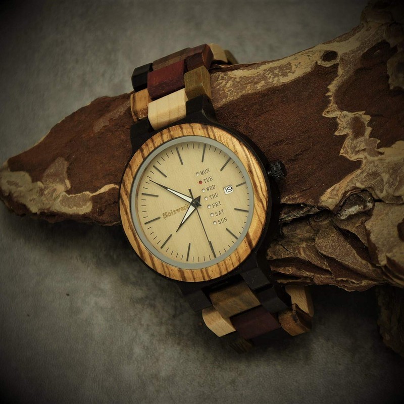 - Handmade Holzwerk Germany men's watch with unique dial, now finally with date and day of the week display. The case and bracelet are made of robust natural wood. The watch is extremely lightweight, therefore particularly comfortable to wear. The watch looks wonderfully elegant thanks to its beautiful wooden strap and immediately catches the eye. The stylish wooden case with a simple dial rounds off the great design very modern