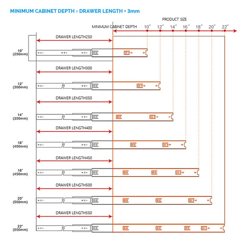 Use on bedroom furniture, sliding cabinet doors, office cabinets, and bathroom cabinets. Installation: There is a plastic buckle on the back of the inner rail and the drawer can be easily taken out by pressing it. Here are some tips for installation Size selection: Slide length less than or equal to drawer depth minus 4 mm.