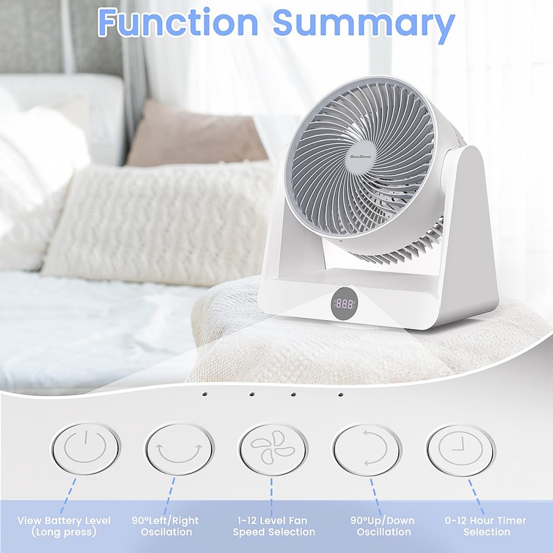 HomBreez 10" Desk Air Circulator Fan with Remote, 90° +90° Oscillating Table Fan, Quiet Portable Battery Powered Fan for Bedroom, Home, Office, 12 Speeds, 12H Timer
