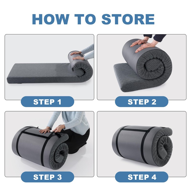 - 【PORTABLE DESIGN】The memory foam camping mattress rolls up easily for storage and travel. The lightweight mat is easy for you to carry. Equipped with storage strap for backpacking, hiking, road trips or yoga classes, etc.Our memory foam sleeping pad measures 72’’ Length, 24’’ Width and 3’’ Height to fit more persons and packing straps are included.