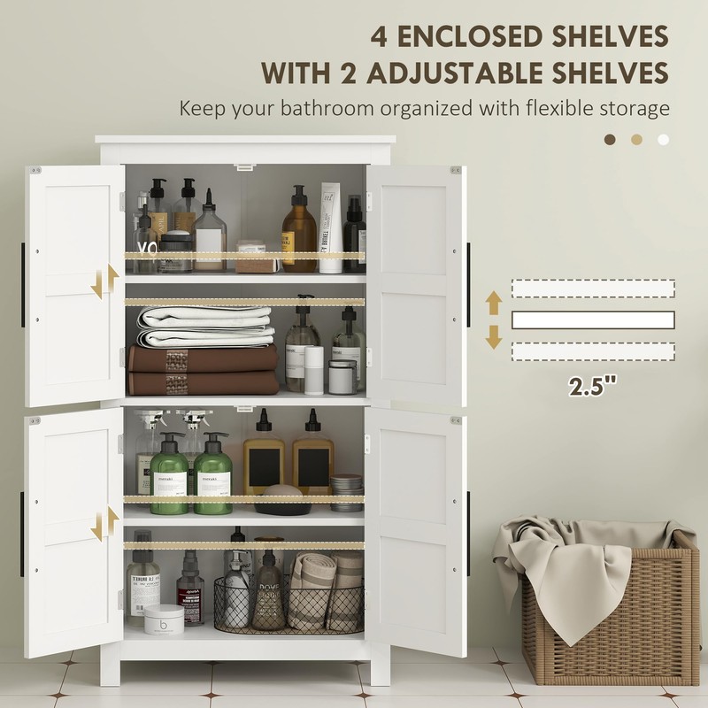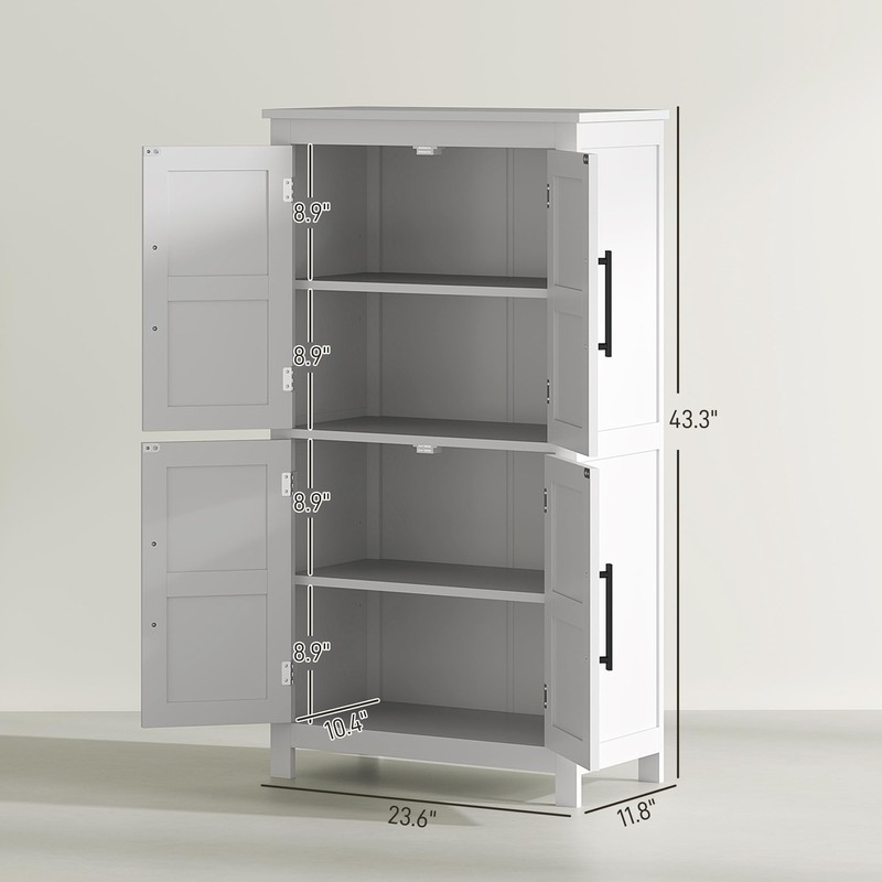 - Spacious Storage Options: This storage cabinet with doors features a four-tier shelf design within two cabinets. It offers ample space for towels, toiletries, and accessories, keeping your bathroom tidy and organized