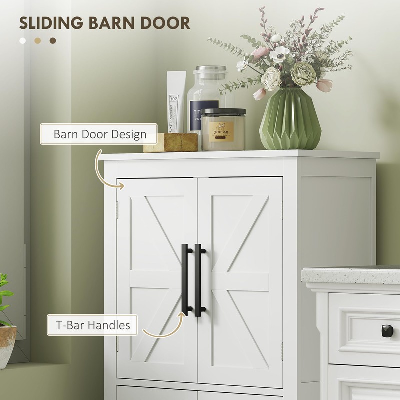 Transform your home's look into stylish, functional spaces with the HOMCOM bathroom storage cabinet. Featuring a four-tier shelf nestled in two cabinets and three-level adjustable shelving, this bathroom cupboard promises neat organization. Flaunting farmhouse charm with barn doors and black metal handles, it's a chic addition to bathrooms, kitchens, or entryways, optimizing corner space effortlessly.