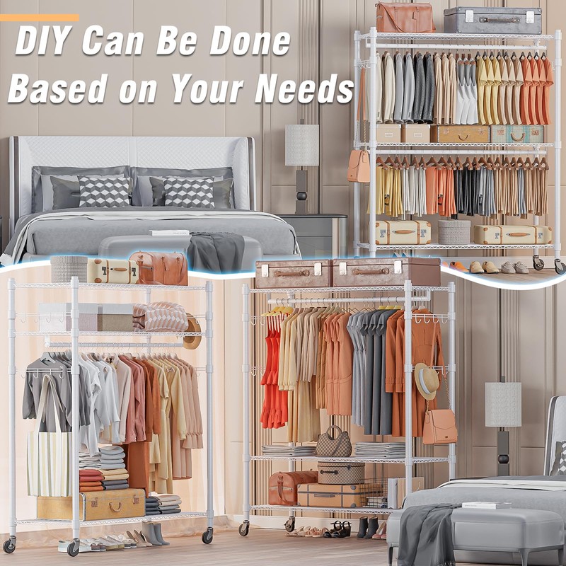 - 【LOCKABLE 360° WHEELS】 Equipped with 4 rolling wheels, 2 of them are locking wheels, designed to allow you to roll this clothing garment rack where ever you need in home. Easy access to bedroom, cloakroom, clothing store, laundry room, walk-in closet and more