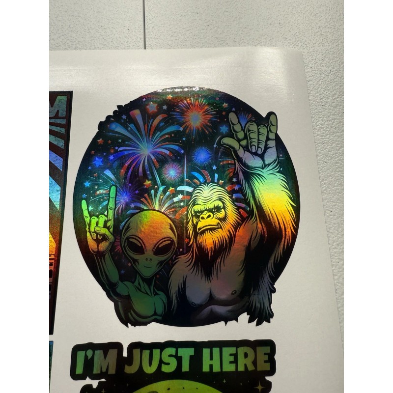 Alien and Sasquatch with fireworks decal printed on holographic vinyl. Decal is 5” tall. Eco solvent ink printed for longer lasting outdoor application. Outdoor rated for 2 years. Comes with application tape installed and directions how to apply.