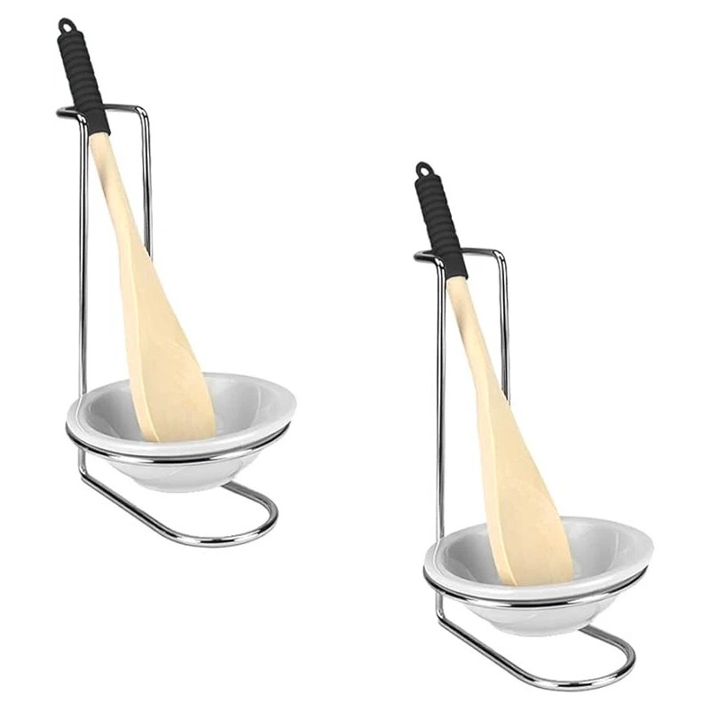 - Cooking and baking can often be a messy task, but it doesn't have to be when you have this wooden spoon rest set at your side. The spoon rest positions utensils upright to allow for liquids to drain in the ceramic bowl to make cleanup a breeze. You can also use the ceramic bowl also as a mixing bowl to prep ingredients. The included wood spoon is also great for stirring and mixing as well. With a compact design, it fits neatly on a countertop without taking up too much space. Spoon Rest with Tray and Spoon, Chrome, (2-Pack)