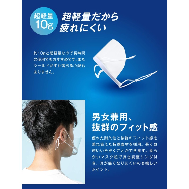 - Anti-fog treatment and anti-fog: The shield has been treated with anti-fog treatment, so you can use it comfortably. It does not get stuffy and is easy to breathe, so you can feel uncomfortable as a mask and not feel too hot or hot. Ultra Lightweight Design: Lightweight at approximately 1.1 oz (30 g), so it is lightweight enough to be worn for a long time without fatigue. And you don't have to worry about your shield falling off. Can be used repeatedly) Adopts special material that combines excellent durability and excellent fit. It is unisex, so anyone can use it for a long time. The rubber is adjustable, so you won't have to worry about hurting your ears