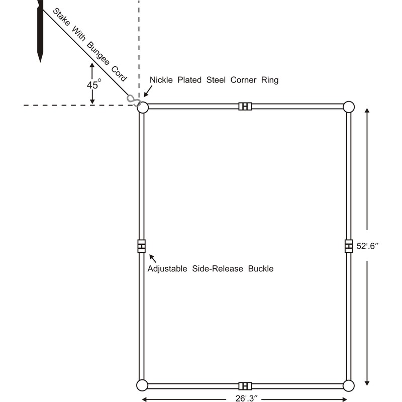 Complete set includes: four 13.2 x 26.3-ft sections with nickel plated steel rings stitched at each corner. They join together in middle of each length with plastic side-release buckle. Allowing you to fine-tune court dimensions with tape measure. Center court markings are the side-release buckles on each end. Two hand winders for storage and four 5-inch steel pegs (#7SB) with approximate 2-ft of bungee cord attached and a small s-hook on each end. The attached bungee cord enables boundary to form a perfect rectangle and will stretch when tripped on for safety.
